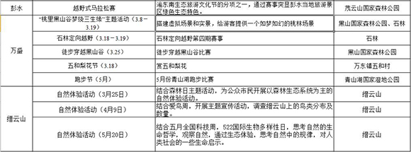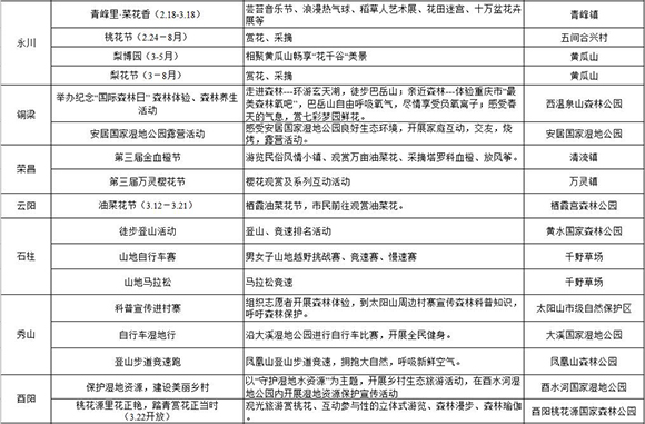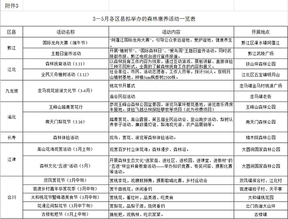 3-5月,各区县也将依托森林公园、自然保护区和湿地公园等森林旅游地开展特色森林康养活动,共计40项,例如江北区农委3.11日就在铁山坪森林公园开展了森林抚育活动,通过互动游戏、展板讲解、直接体验三种不同形式,全面的了解森林抚育工作的内容和意义,超过400个家庭积极参与;黑山国家森林公园将举行“桃里黑山谷梦绕三生缘”石林体验主题活动,秀山大溪湿地公园将进行全民健身自行车比赛,铜梁安居国家湿地公园将开展露营活动,彭水茂云山国家森林公园将开展越野式马拉松赛,江津区5月份还将全面开展森林生态文化“进家庭、进社区、进校园、进课堂、进教材”的“五进”林业科普教育活动,让生态文化教育实现社会全覆盖,缙云山在3-5月都有各类精彩的自然体验活动。