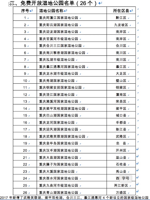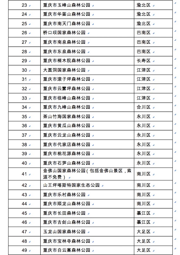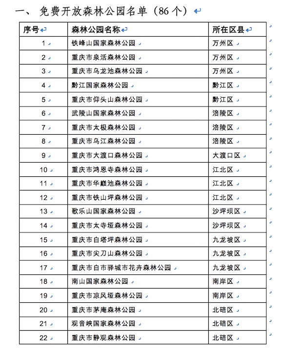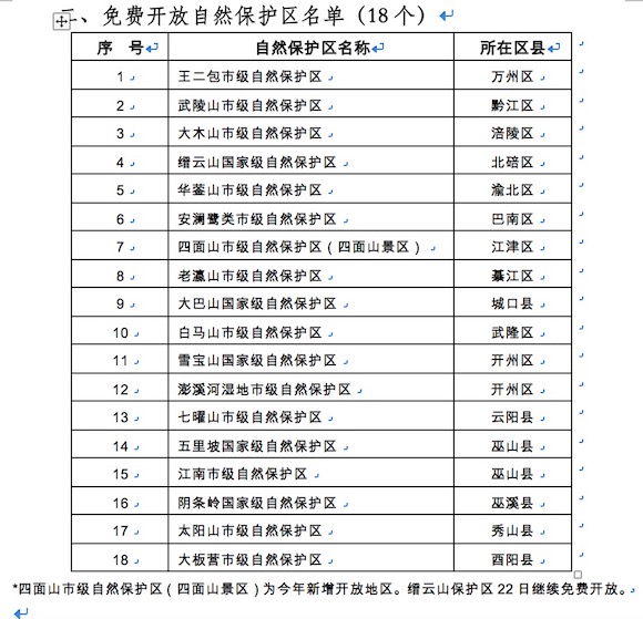 此外,黑山国家森林公园(包括黑山谷景区)、缙云山保护区等地的开放时间比全市还多一天,黑山谷从18日周六起就免费开放,缙云山是在22日世界水日期间也免费开放。