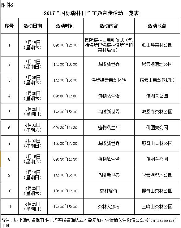 今年国际森林日宣传活动的系列森林康养活动将依次在铁山坪森林公园、彩云湖湿地公园、缙云山自然保护区、佛图关公园、鸿恩寺森林公园、照母山森林公园、玉峰山森林公园开展。
