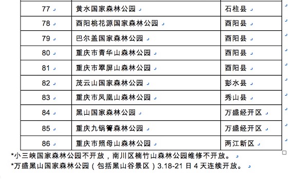3月19日-3月21日“国际森林日”期间,全市除小三峡国家森林公园、楠竹山森林公园(维修中)以外,仙女山、金佛山、大圆洞、茂云山等86个市级以上森林公园,璧山秀湖等26个市级以上湿地公园,缙云山保护区等18个市级以上自然保护区合计130处森林旅游地将向市民免费开放3天,开放地点与去年相同,但今年四面山自然保护区包括四面山景区作为新增地点也参与了免费开放。
