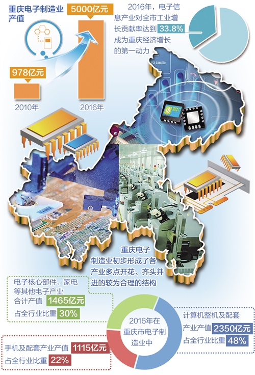 数据显示,重庆市电子制造业产值由2010年的978亿元增长至2016年的5000亿元。2016年,电子信息产业对全市工业增长贡献率达到33.8%,成为重庆经济增长的第一动力。