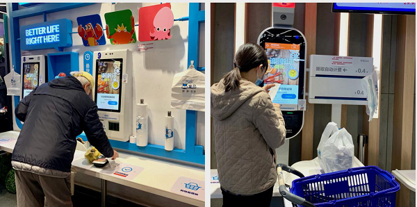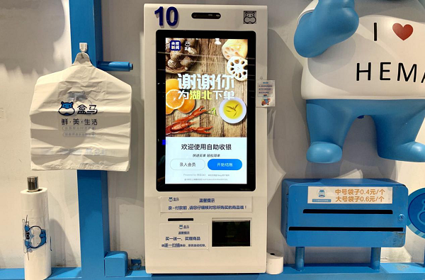 ▲盒马鲜生自4月2日至6日在全国220家门店自助收银机上投放央视新闻微倡议公益海报。
