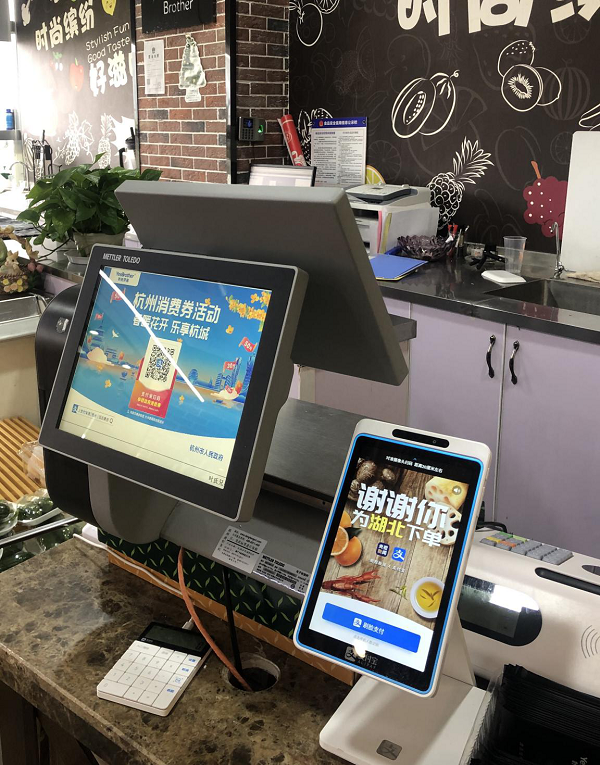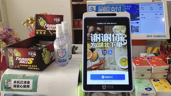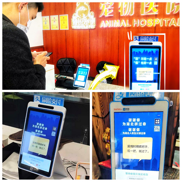▲支付宝蜻蜓在全国367个城市的35万多台智能刷脸设备上播放央视新闻“谢谢你为湖北拼单”微倡议公益海报。