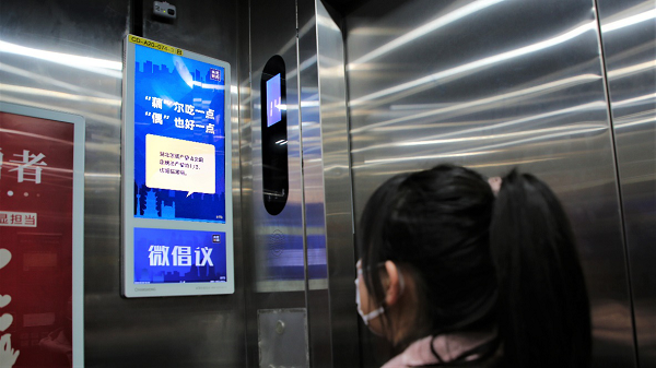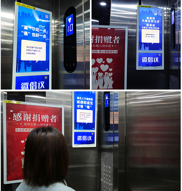 ▲在北京、上海、成都、武汉的住宅与写字楼内,近2万部新潮电梯智慧屏播放央视新闻“谢谢你为湖北拼单”微倡议公益海报。
