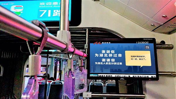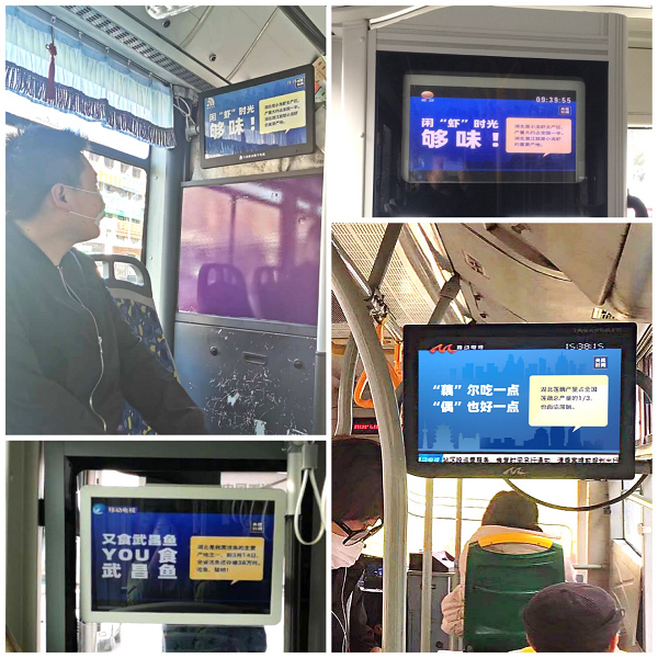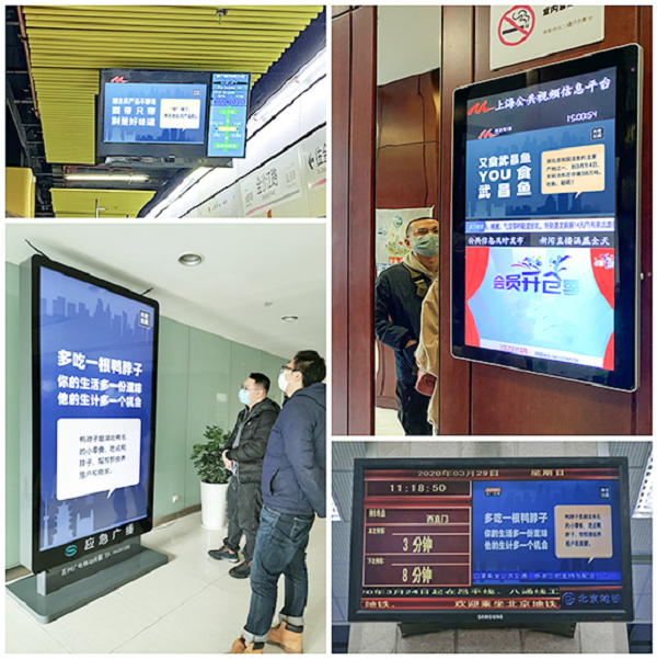 ▲北京、大连、济南、苏州、兰州、上海的地铁、公交移动电视播放央视新闻“谢谢你为湖北拼单”微倡议公益海报。