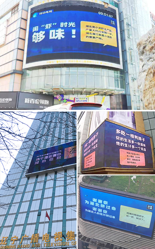 ▲济南、嘉兴、南昌、沈阳的商城,购物中心、城市广场、办公大楼户外屏幕播放央视新闻“谢谢你为湖北拼单”微倡议公益海报。