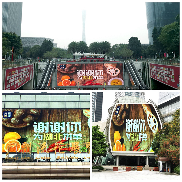 ▲广州花城广场、流花展贸中心等户外公信屏播放央视新闻“谢谢你为湖北拼单”微倡议公益海报。