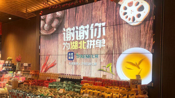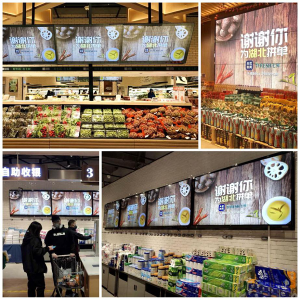 ▲京东七鲜在北京、上海、天津等城市的超市门店电子屏播放央视新闻“谢谢你为湖北拼单”微倡议公益海报,同时开辟湖北产品专区供顾客选购。