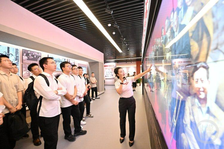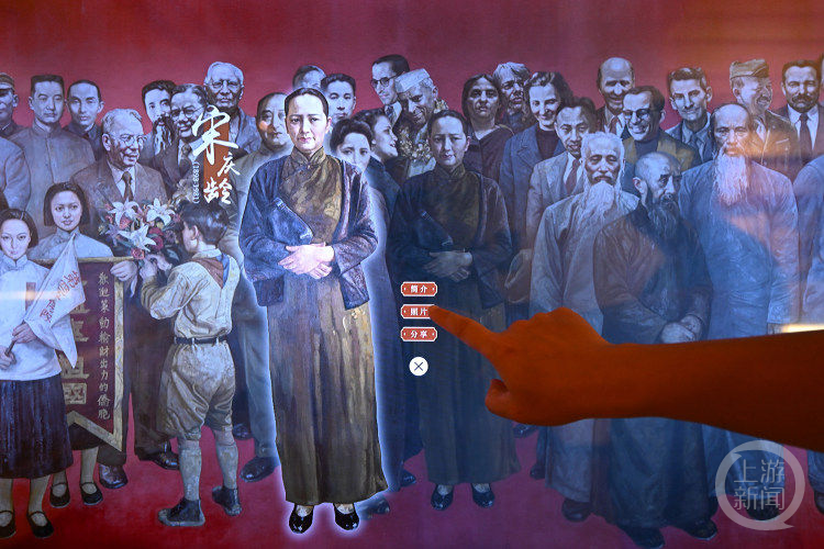 据介绍,红岩革命历史博物馆先是对这幅巨大的油画原作进行了高精度数据采集,再根据馆藏资料制作了活态化展示的内容。现在大家站在这个巨大的触摸屏前,每点击一个人物就能看到他们的简介、历史故事,其实是平面的文案和空间设计,以及数字展示技术相融合,综合了大屏交互、人机互动、红外触控等数字展示的一个综合系统。