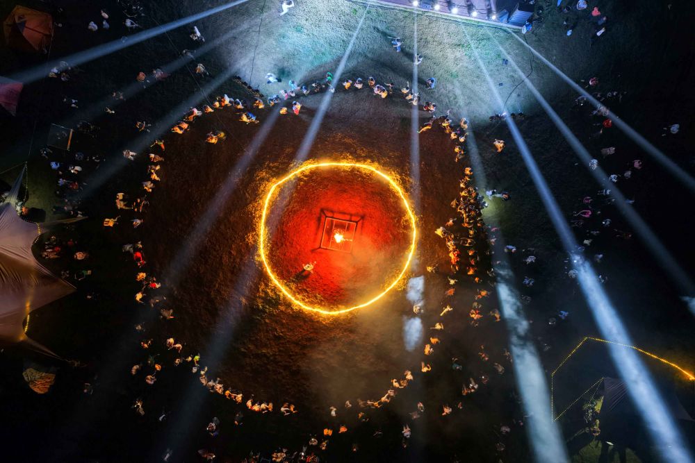 除了丰富的日间活动以外,当夜幕降临,露营基地内还燃起了熊熊篝火。活动主办方还准备了非遗火壶表演和绚丽的烟花秀。