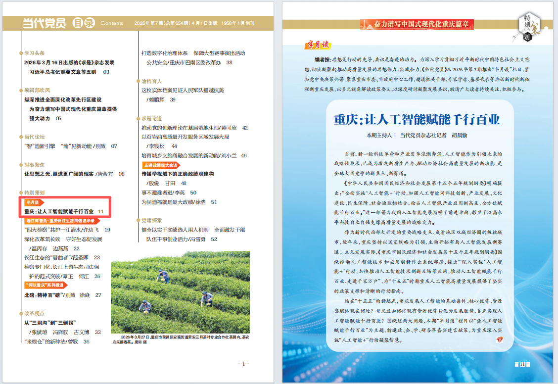 编者按:思想是行动的先导,共识是奋进的动力。为深入学习贯彻习近平新时代中国特色社会主义思想,切实凝聚起推动高质量发展的思想伟力、实践合力,《当代党员》从2026年第7期推出“半月谈”栏目,紧扣党中央决策部署,聚焦重庆市委、市政府中心工作,邀请机关干部、专家学者、基层代表等共话新时代新征程新重庆发展,以多元视角解读政策要义,以深度研讨凝聚发展共识,敬请广大读者持续关注、积极参与。
