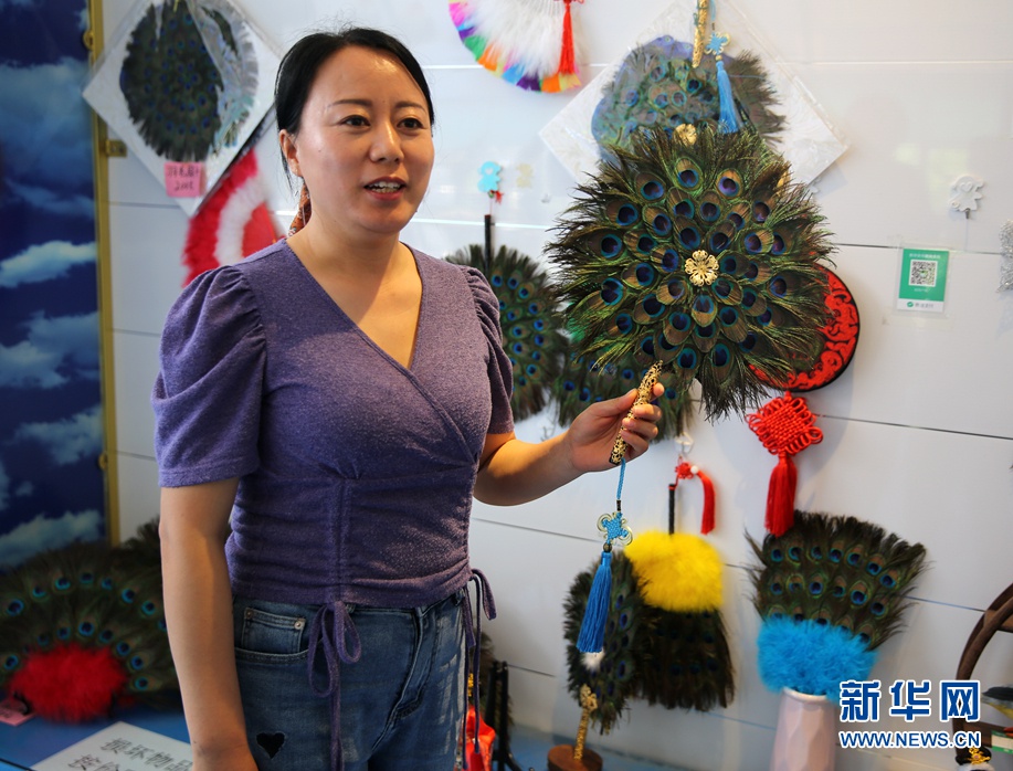 周海南展示用孔雀羽毛制作的手工艺品。新华网 石毅 摄