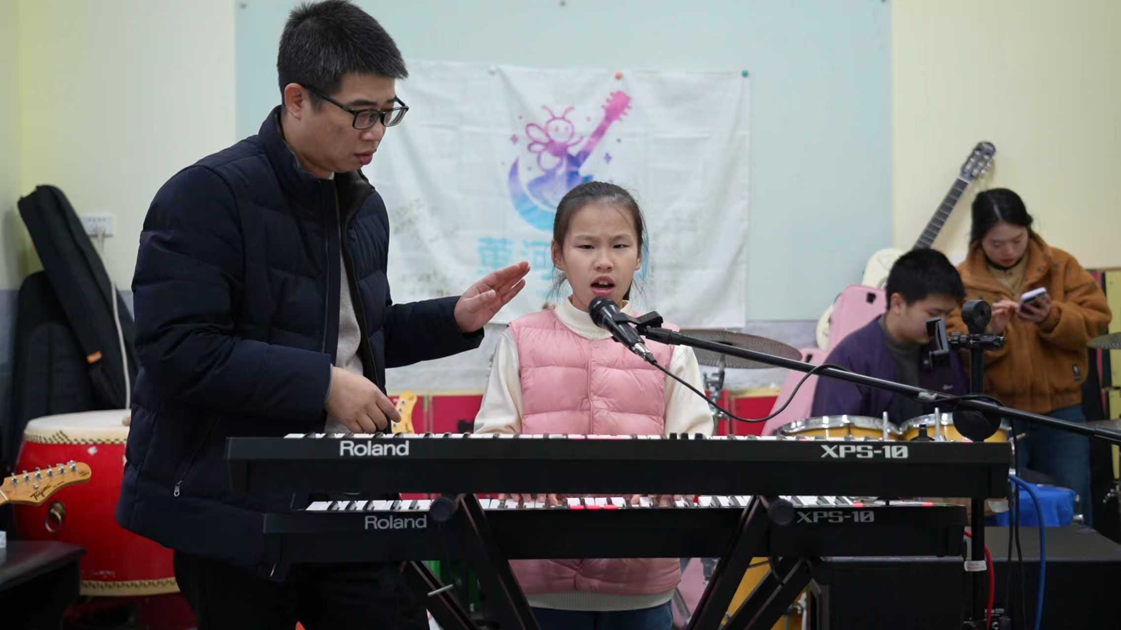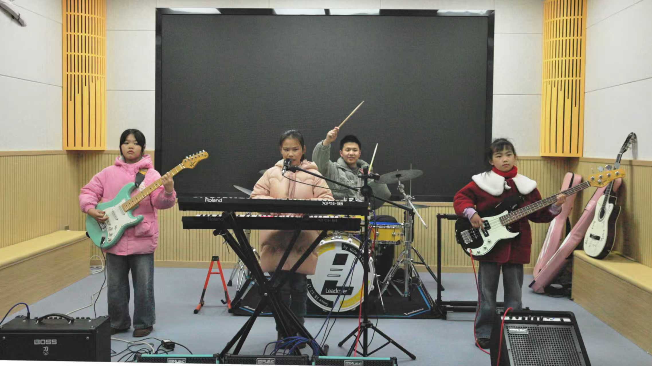 不远处,贝斯手瞿欣悦正跟着指导老师周磊练习,指尖偶尔偏离琴弦,周磊就轻轻握住她的手,一点点调整位置。“她最开始专注力只有两三秒钟,稍微有一点动静就会分心。”周磊回忆,为了帮瞿欣悦集中注意力,他和邓涵采取二对一的教学方式,一个在前讲解,一个在后辅助,一点点提醒、一遍遍磨合,整整一个多月,瞿欣悦才慢慢能够专注地完成一段练习。